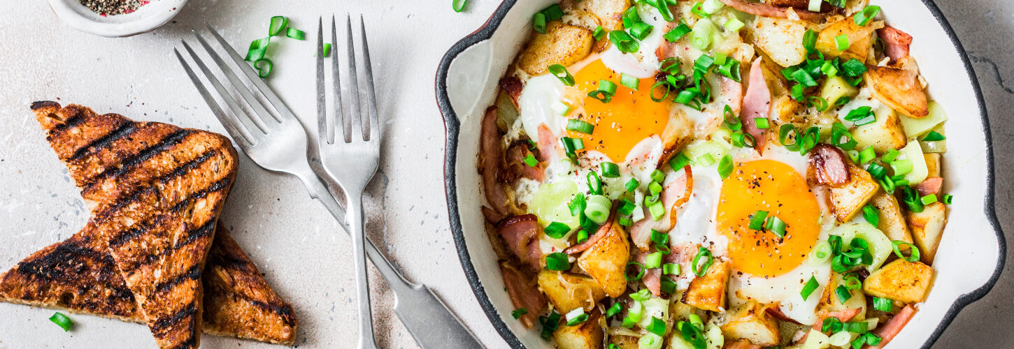 9 Spoon the potato hash from the frying pan and divide between two plates. Add an egg(s) to each and enjoy!